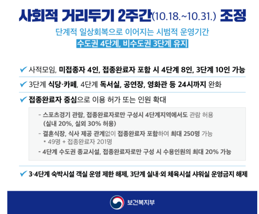 사회적 거리두기의 단계가 낮아지면 낮아질 수록 백신접종자와 미접종자의 차이는 줄어들겠지만, 단계가 높은 상태에서 유지된다면 접종완료자가 당분간은 더 많은 것을 이용할 수 있게 될 것 같습니다.